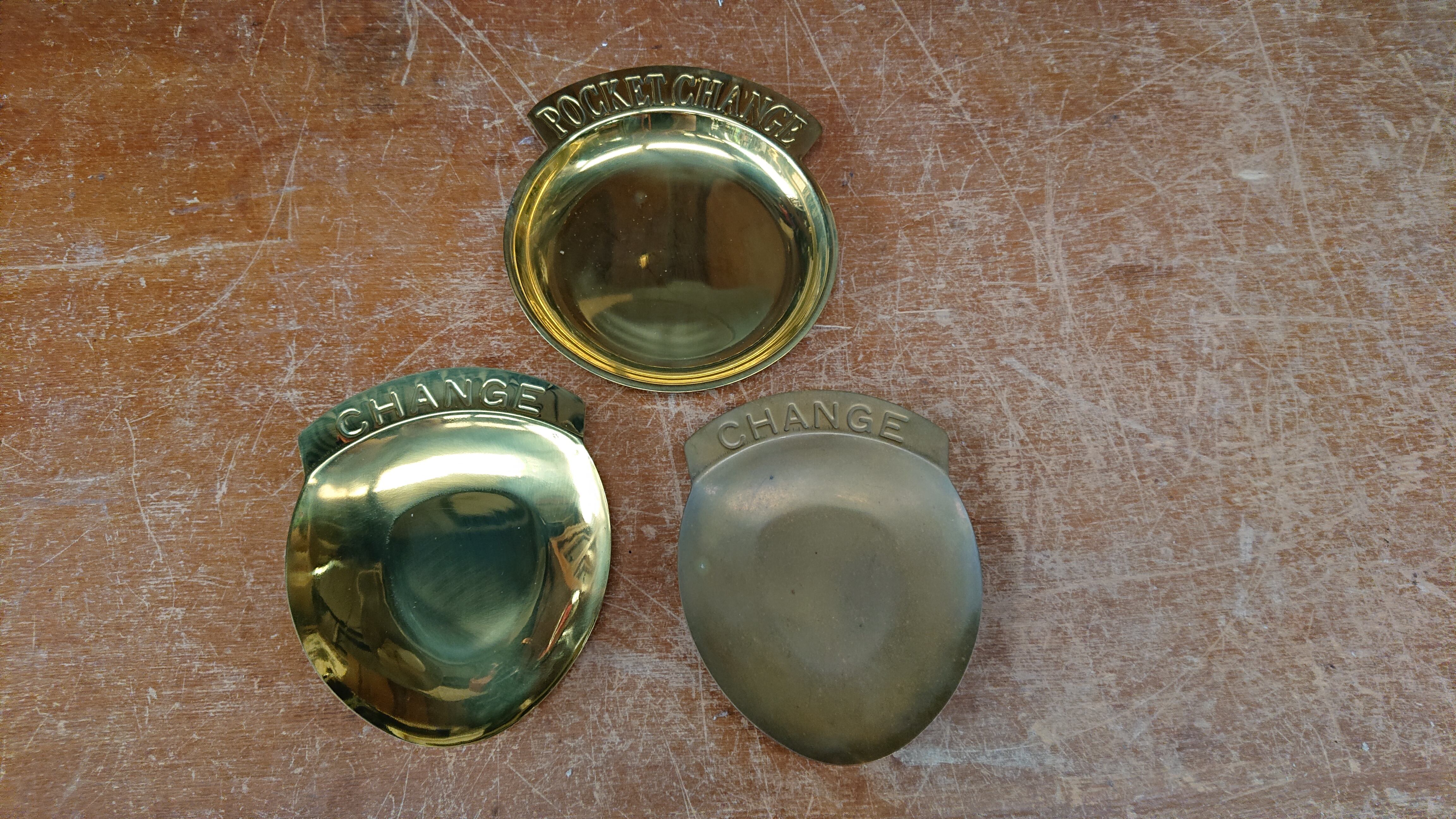 縁にCHANGEとエンボスされた真鍮製のトレイ