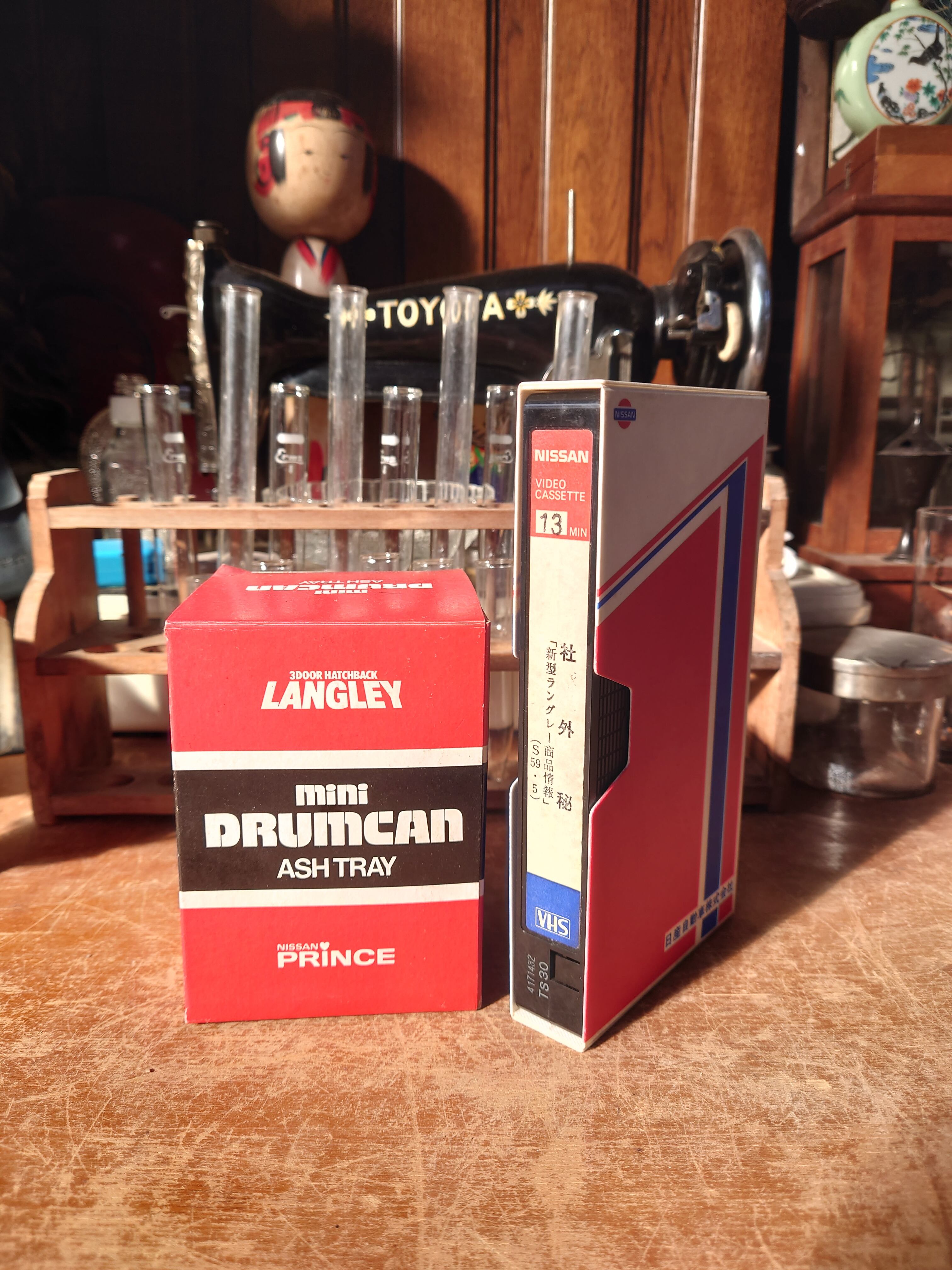 【送料込み】【昭和レトロ】日産プリンス新型ラングレー2代目(N12系) ノベルティ ドラム缶型灰皿+レアな社内教育用ビデオ