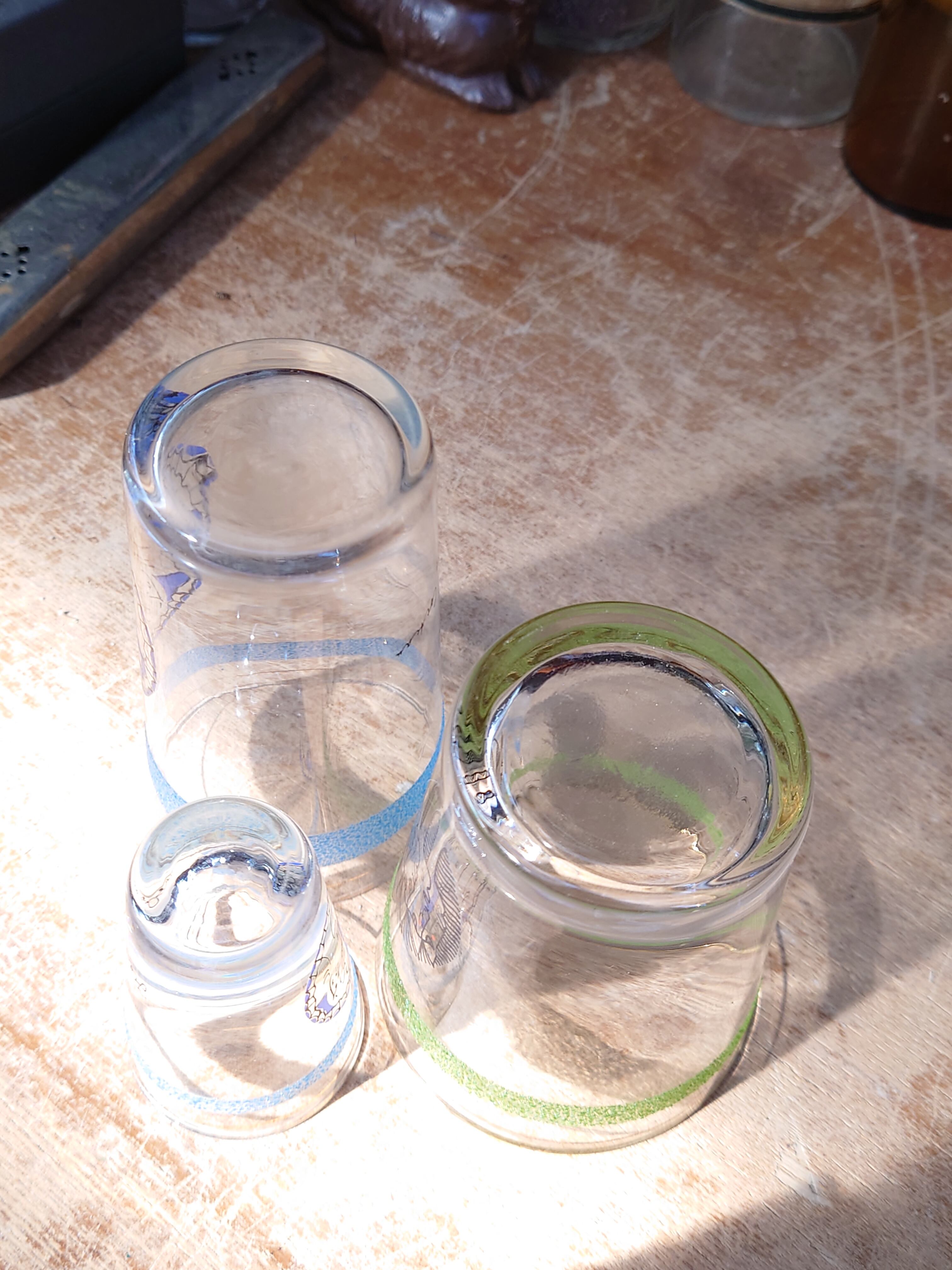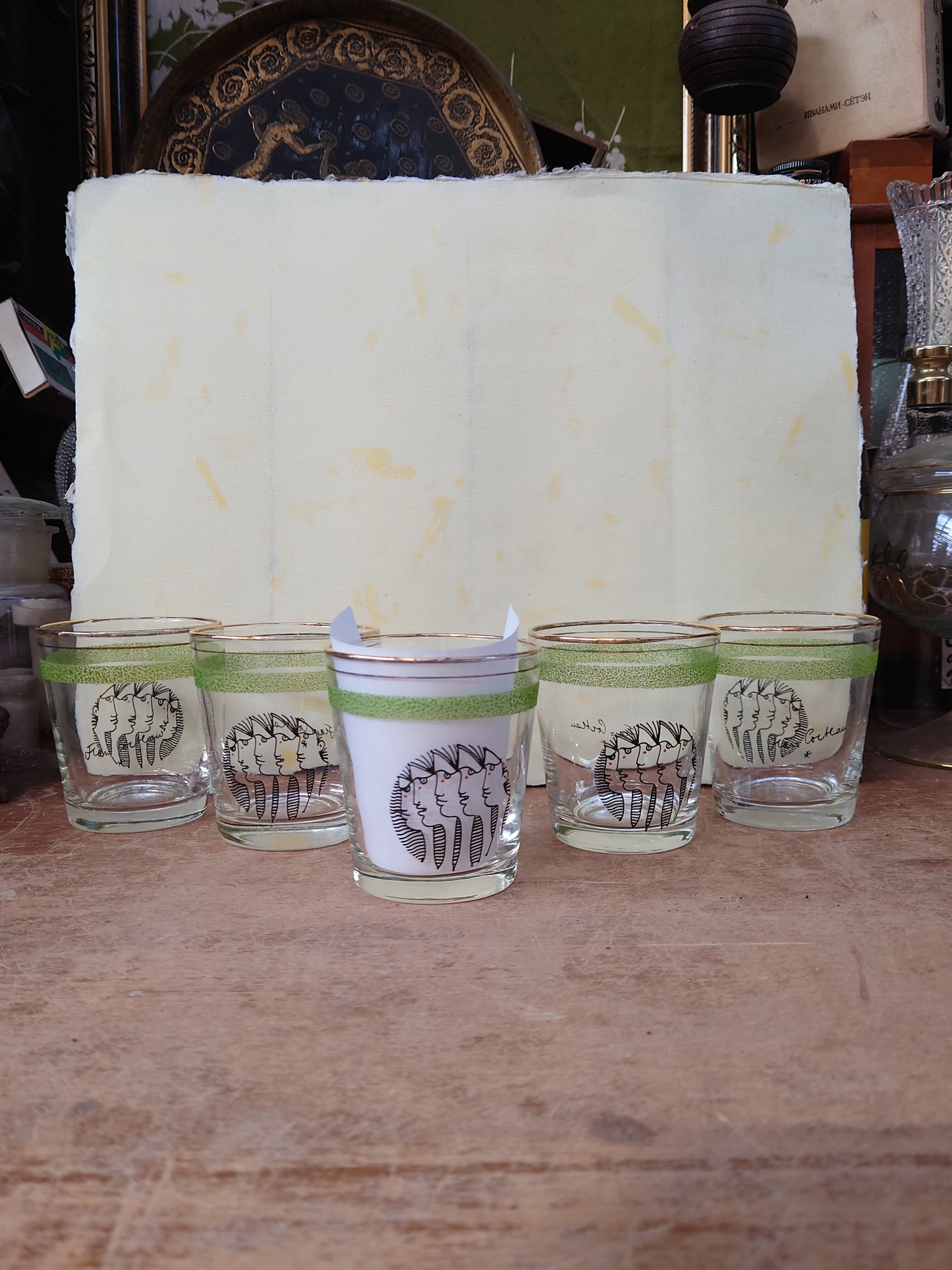細やかな線描と薄く透けたブルーやグリーンのラインが美しいウォーターグラスとショットグラスのセット