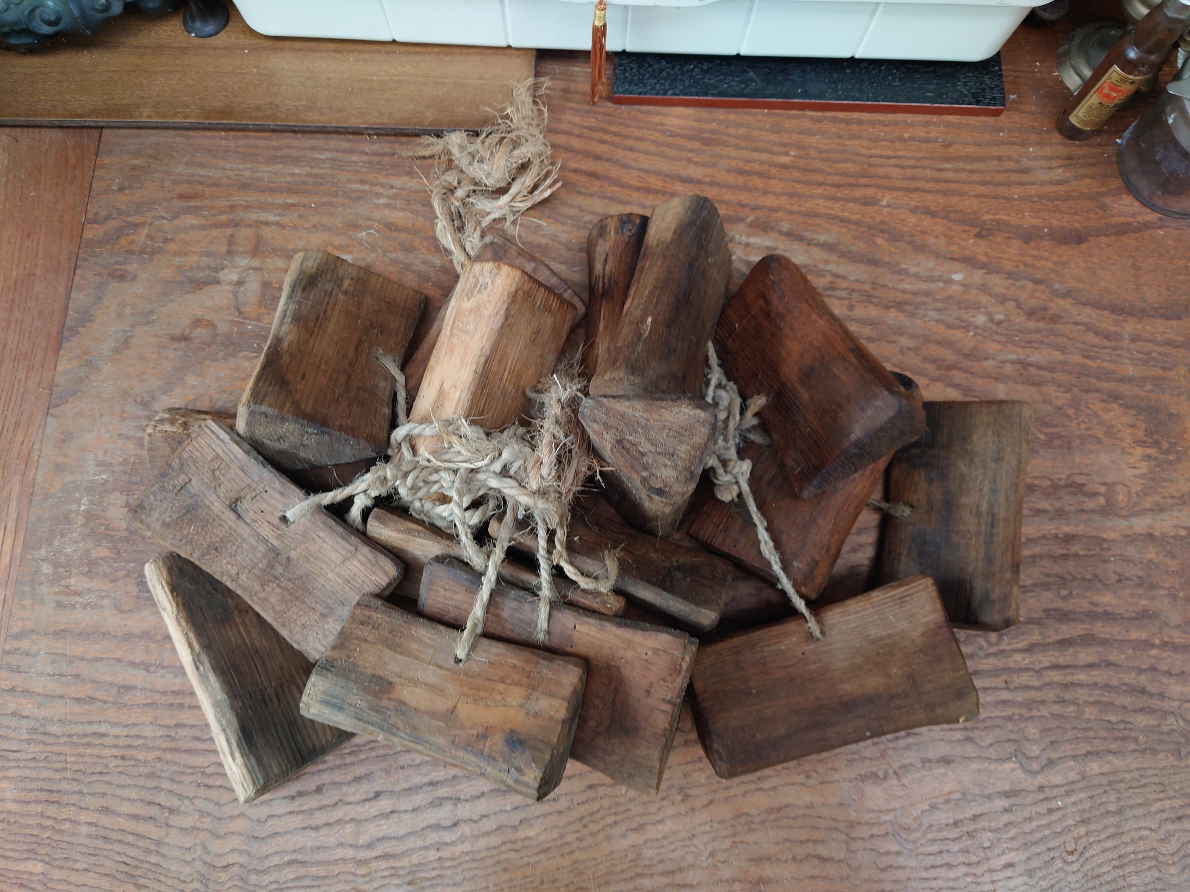 木錘は12〜13×6〜7×3〜5センチの三角柱が17個縄でつながっている状態